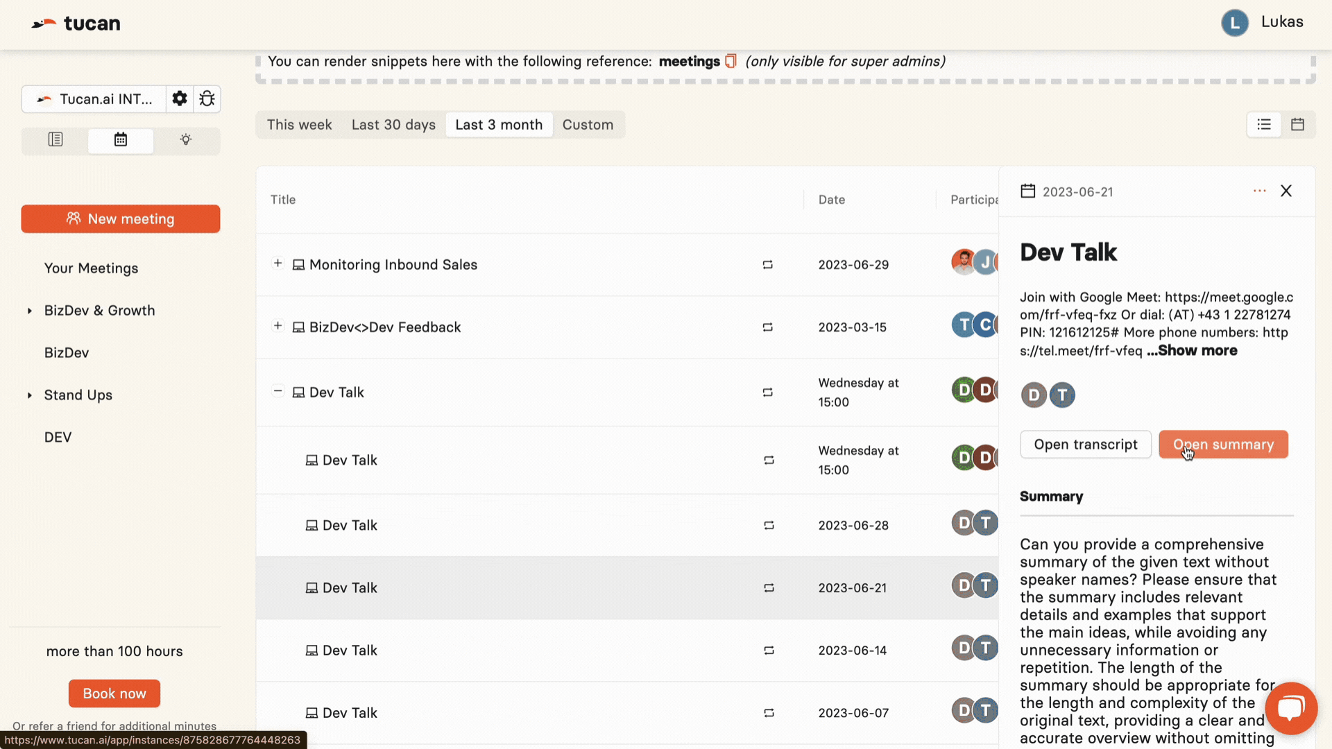 Standard, highlight and follow-up summaries can be easily created with Tucan.ai. However, enterprise customers can also access complex custom summaries. With Tucan.ai one or more custom statements can be used to pull out different information depending on the type of meeting.